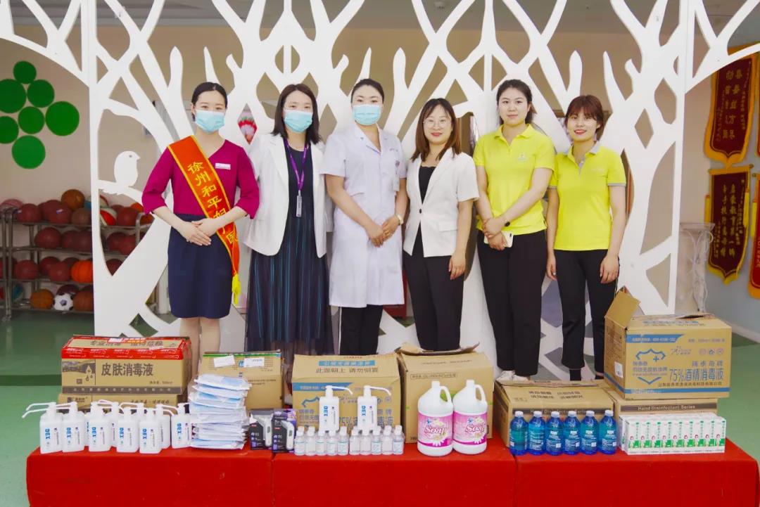 徐州和平妇产医院向阳光兰庭幼儿园捐赠了75%酒精、酒精消毒喷雾、免洗手消毒液、皮肤消毒液等约300瓶,以及洗手液3桶、一次性无菌口罩500支,助力幼儿园加强疫情防控、共同守护“祖国花朵”的生命安全和身体健康。