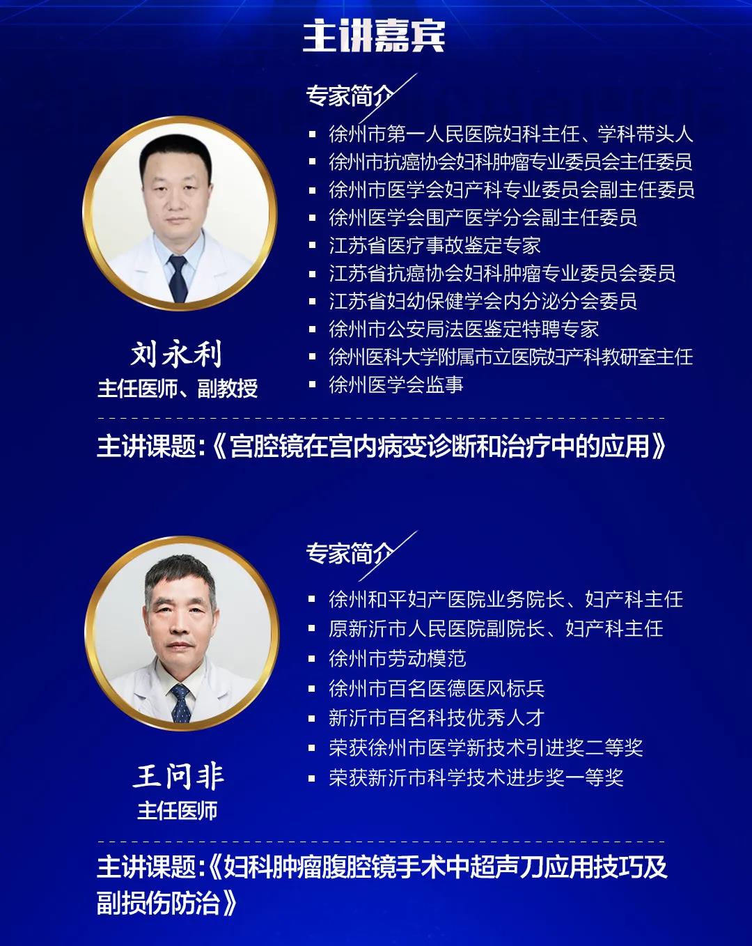 此次论坛特别邀请到了徐州市第一人民医院妇产科教研室主任、妇科主任、学科带头人刘永利教授与徐州和平妇产医院业务院长、妇产科主任王问非两位本土知名妇产科专家,聚焦妇科微创诊疗领域的新理论、新进展、新技术与新方法,即将带来一场妇科腔镜微创领域的学术交流与碰撞。