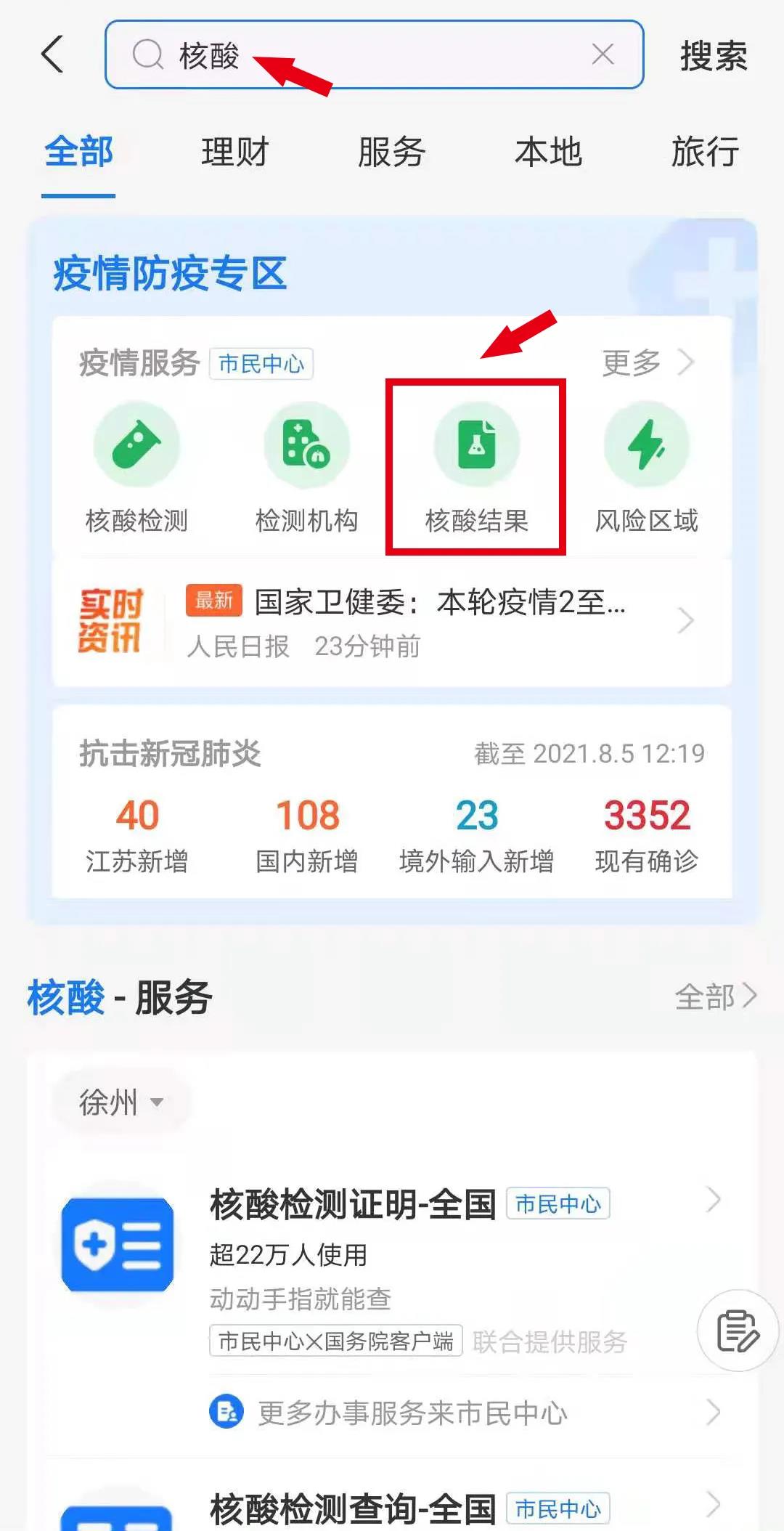 ② 支付宝搜索【核酸】,查询【核酸结果】