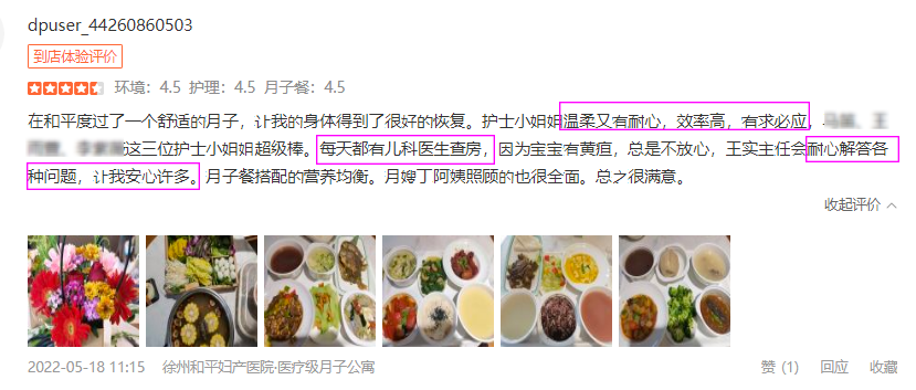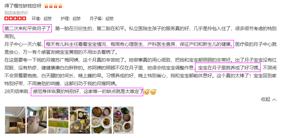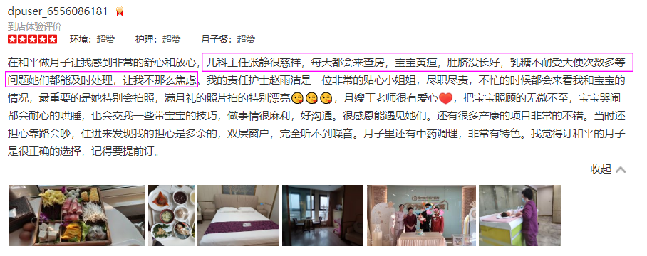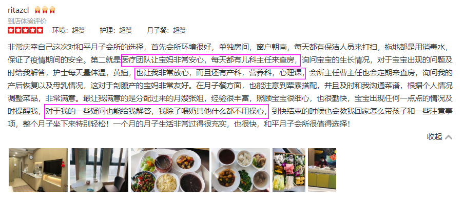 看完这些五星好评,你get到选择一家月子最重要的是什么了吗? 在妈妈因为刚生产、伤口缝针、日复一日的熬夜喂奶、身材受损的月子里,更需要医疗级的呵护服务,这也是很多宝妈看中和平的原因。就像上面宝妈自述的,如果因为其他的而让自己和宝宝得不到专业照顾,那坐月子不就本末倒置了吗?