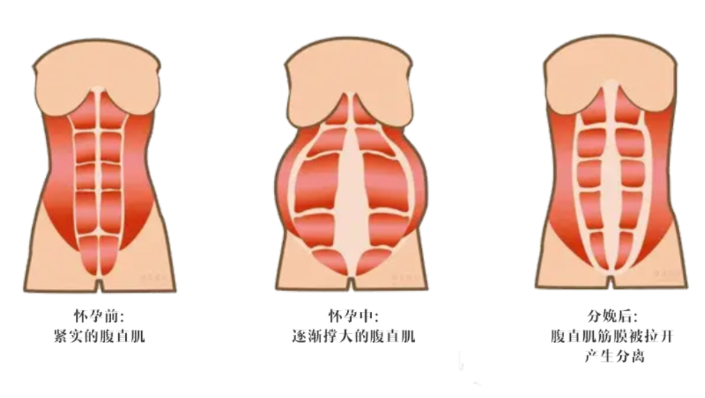 腹部的左右两边是由腹直肌筋膜连接起来的,连接的地方称为腹白线。孕后期,随着胎儿越来越大,两条腹直肌被逐渐拉长,慢慢便产生了分离,当左右腹直肌的距离在2cm甚至更多时,这时便产生了「腹直肌分离」。
