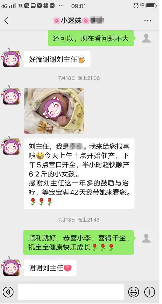 “我很幸运,遇见了刘福民主任,很感谢刘福民主任的鼓励与治疗,让我收获小棉袄一枚,心中没有了遗憾,后面要二胎还来找主任~”