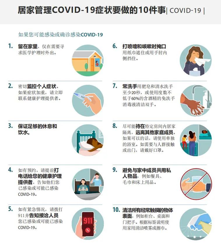 (1) 新冠病毒感染相关症状,如有无发热、咽干、咽痛、流涕、鼻塞、咳嗽、喘敝、气短或呼吸困难、腹泻、嗅觉和味觉改变、食欲有无明显下降,大小便有无异常等;(2)原有基础疾病相关症状,有慢性肺部疾病、糖尿病、高血压、心血管疾病者监测有无头痛、头晕、气短、憋喘,胸闷、心慌、胸痛等,有高血压者监测血压、心率或脉搏,有糖尿病者根据既往血糖情况监测快速血糖,有气短、憋喘、胸闷等呼吸困难症状时监测呼吸频率、指氧饱和度 ( 特别是静息状态和活动后的指氧饱和度 )。2.居家康复人员隔离的第 6、7 天连续 2次核酸检测 Ct值≥35 则解除隔离。3.出现发热、咳嗽等 11 类症状时,如出现发热、咳嗽等症状,可进行对症处置或口服药治疗。有需要时也可联系基层医疗卫生机构医务人员或通过互联网医疗形式咨询相关医疗机构。4. 居家康复人员如出现严重的症状,可通过自驾车、120 救护车等方式,转至相关医院进行治疗,如需帮助可联系社区工作人员5.阳性感染者在隔离期间应单独房间居住,遵守居家康复人员及同住人员须知,控制外出。讲究咳嗽礼仪,咳嗽、打喷嚏时用纸巾或肘部遮盖口鼻,不随地吐痰,用后的纸巾及口罩丢入专门的带盖垃圾桶内。如病情允许,感染者在室内也应戴好口罩,尽量减少到室内其他区域活动。6.未成年人、生活不能自理或其他情形需有人进行生活照顾的,要确定相对固定的 1名家庭成员作为陪护进行照顾。首选身体健康且完成全程疫苗接种及加强剂的人员。如阳性感染者为哺乳期母亲,在做好个人防护的基础上可继续母乳喂养婴儿。7.隔离期间除生活必需品和药品外,不提倡订购其他快递、外卖。因取生活物资等需要开门前,务必先关闭窗户,观察对门是否开门( 避免对面房间同时开门),开门时务必戴好 N95/KN95 口罩,开门环节应轻拉慢推,开门前后做好手卫生。——THE END——