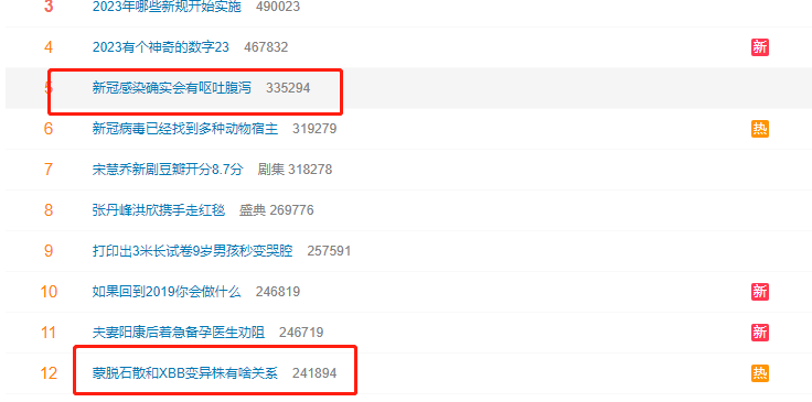 同时,今天上午,新浪微博热搜榜关于“呕吐腹泻”、“XBB毒株”、“蒙脱石散”等词条一直热度不减。