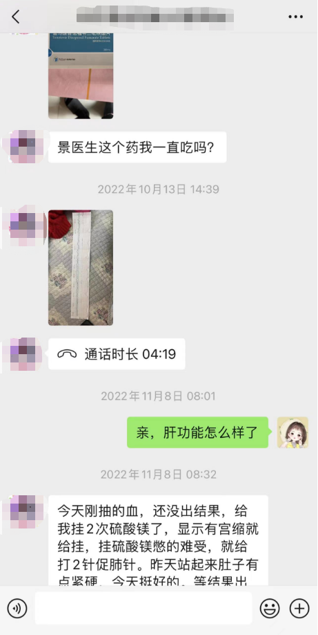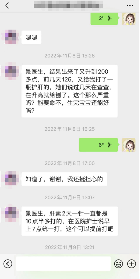 在接下来的治疗中,王女士一直积极配合治疗,每次看诊都早早的来到医院,赶在第一个看诊,在得知肚里的宝宝健健康康后,才能安心回家养胎,到了孕中期的时候,王女士肝功能异常增长,景锐霞医生连忙调整治疗方案,并给予保肝治疗,好在有惊无险,一周后,数值渐渐恢复正常,但是景医生并没有掉以轻心,时不时的在微信上询问王女士的身体情况,时间久了,两人之前变得熟悉起来,王女士也经常在微信上询问景医生。