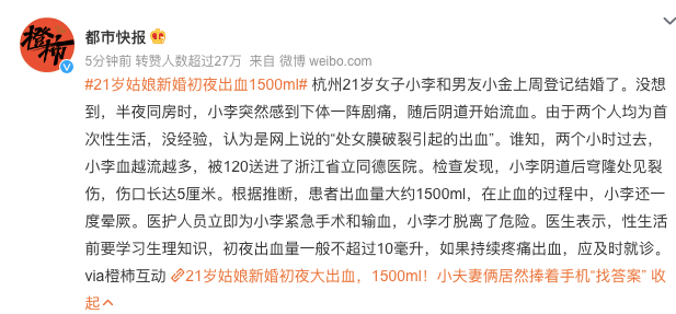 这是前段时间一则真实的新闻。一位21岁新娘新婚初夜出血1500ml被紧急送医……