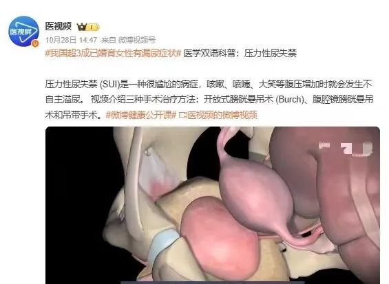 压力性尿失禁(stress urinary incontinence,SUI)是指在喷嚏、咳嗽、大笑或运动等腹压增高时出现尿液不自主的从尿道口漏出的一种疾病。主要见于女性,中国成年女性的SUI患病率高达18.9%。